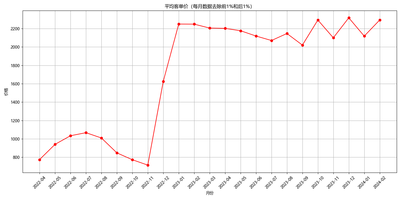 plt.title('平均客单价(每月数据去除前1%和后1%)')